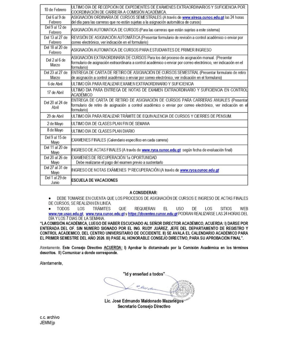 Calendario Académico Primer Semestre 2026